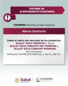 La Comisión Federal para la Protección contra Riesgos Sanitarios (COFEPRIS) informó sobre el retiro del mercado que realiza la empresa SANULAC NUTRICIÓN MÉXICO, S. A. de R.L. de C.V., de fórmulas para lactantes y alimentos para niños de corta edad, importadas de Francia, de las marcas ALULA® GOLD PREMIUM 1, 2 y 3, ALULA® GOLD KID PREMIUM y ALULA® GOLD COMFORT PREMIUM, como medida preventiva ante la posible contaminación de cereulida toxina, producida por el microorganismo Bacillus cereus, detectada en uno de los ingredientes utilizados en su elaboración: