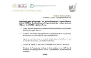 La Fiscalía del Estado de Jalisco, junto con las instancias correspondientes del Instituto Mexicano del Seguro Social (IMSS), investigan la muerte de la médico residente Nicole Stark Carrillo, de 27 años, quien fue localizada sin vida dentro de la Clínica 46, en Guadalajara.