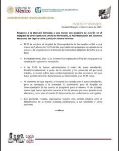 “A las 13:08 le fueron administrados 2 viales de suero antialacrán. Desafortunadamente, a pesar de la atención y los esfuerzos del personal médico, la menor sufrió paro cardiorrespiratorio en dos ocasiones, sin que fuera posible revertirlo, declarándose su fallecimiento a las 13:45 horas. Al momento en que ingresó, el Hospital no contaba con el suero antialacrán, pero se consiguió a la brevedad. El surtimiento de los sueros se programó para el viernes 17 de octubre, sueros que fueron aplicados durante el fin de semana por otras picaduras de alacranes, y otro para el martes 21 del presente, los cuales fueron entregados”.